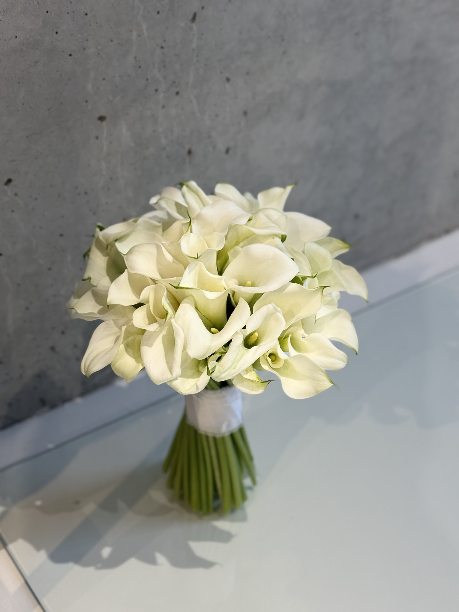 A timeless and elegant bridal bouquet featuring classic calla lilies, artfully arranged in a clean, modern style. This refined design is perfect for the minimalist bride seeking sophistication and grace, with the option to customize for a personal touch and subtle European charm. Available in two sizes.