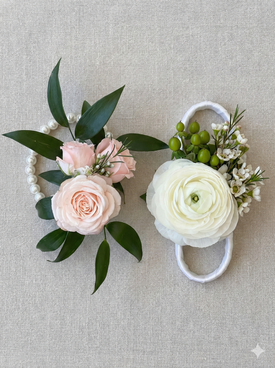 The mothers-of-the-grooms were thrilled with their beautiful wrist corsages—gorgeous flowers, just the right size, and lovely pearl elastics to keep them in place.